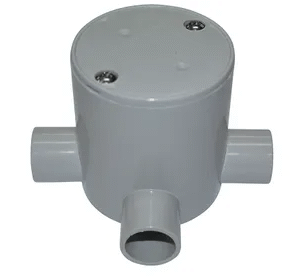 - Moulded PVC grey junction box with a circular shape and deeper profile.