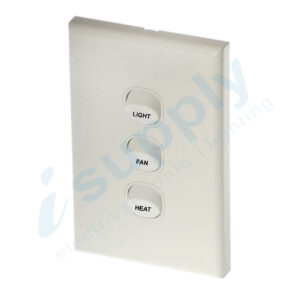 $30.09 inc GST1 x 3 Gang Wall Switch With Printed Switch Mechs – LIGHT, FAN& HEAT Capable of two way switching, Brand: Clipso Colour: White Rating: 250 Volts, 10Amp High Quality Product – Easy to Install Nice round edges and 12mm Thickness Original Series PowerPoint’s and Switch’s By Clipso- Suits all Standard Size Mounting Blocks / Brackets…