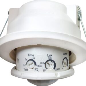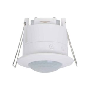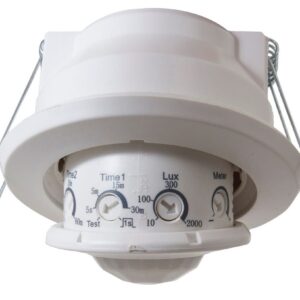 Mini Flush Mount Presence Detector (White) Manual override Adjustable time, distance & Lux Integrated power box Cutout diameter 38mm 300mm pre-wired cable Polycarbonate construction Minimum load 10W