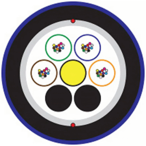 Dry blocked central non-metallic strength member with fibres contained in jelly filled loose tubes (12/tube) Blue nylon jacket over PE sheath For direct burial underground use Insect-resistant nylon jacket