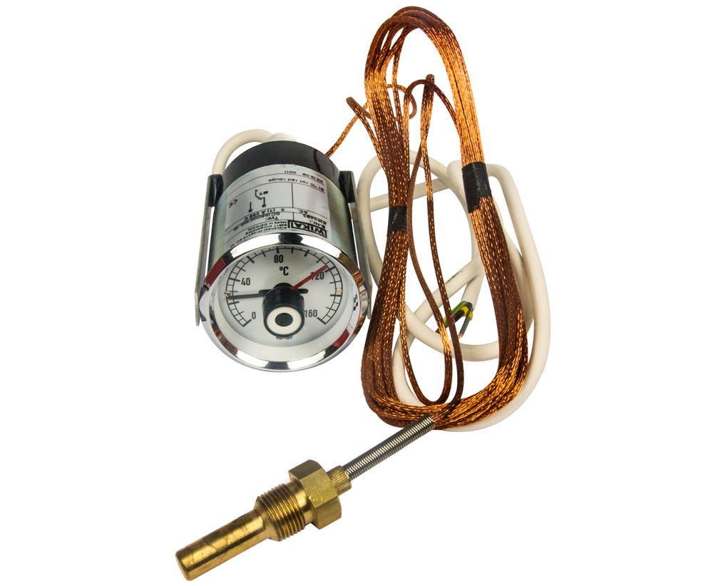 Trade-grade analogue combistat combining thermometer and thermostat control from 0–160 °C in a compact, panel-mount design.