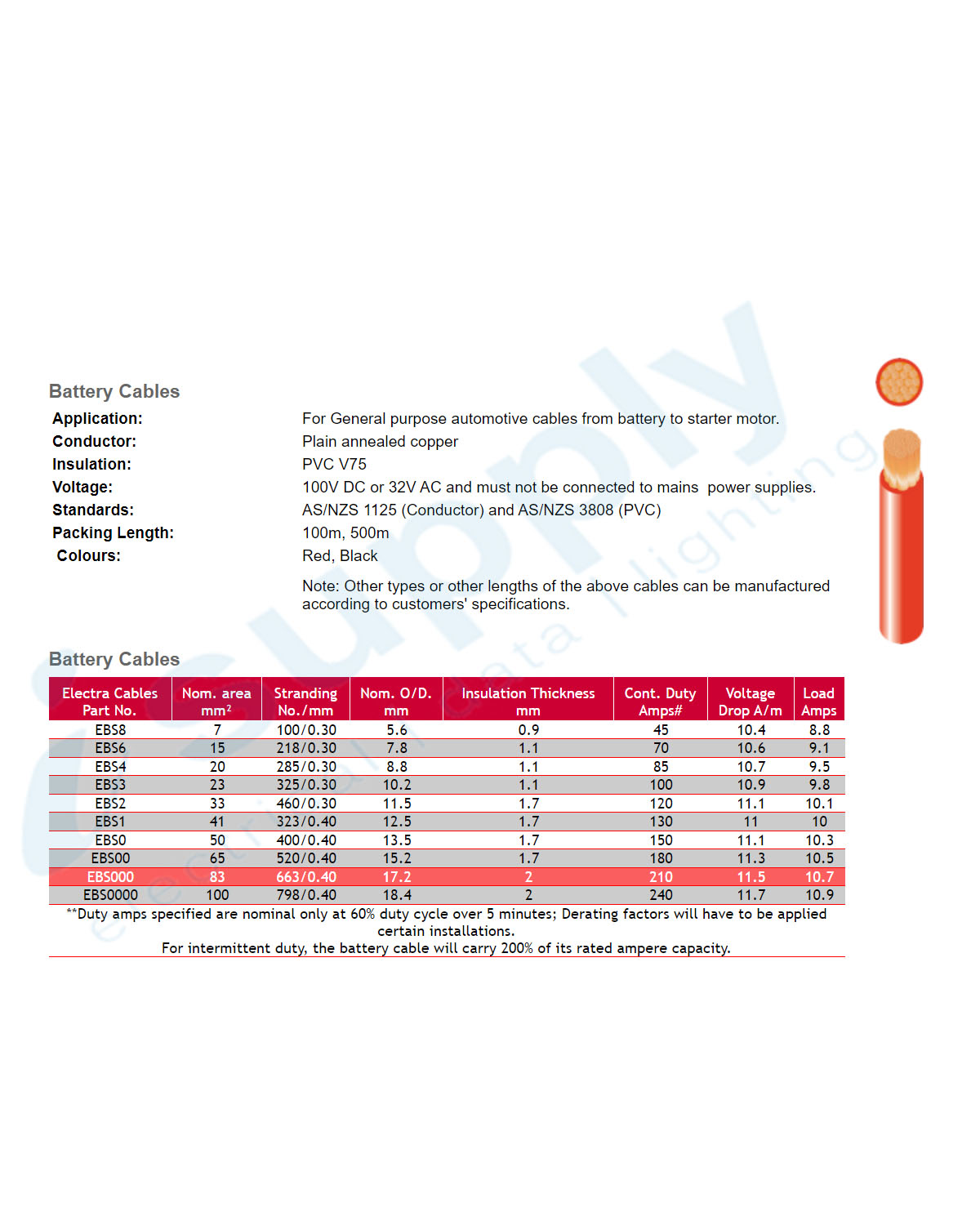Application: For General purpose automotive cables from Battery and Starter Cable, Dual Battery Systems, Conductor: Plain annealed copper