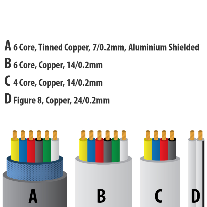 • 1x 7/0.2mm 6-Core tinned copper, aluminium shielded cable
