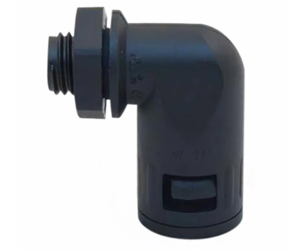 - Non-metallic 90 Degree connector for liquid tight conduit, halogen free PA6 nylon, extreme low fire hazard UL94 V-0