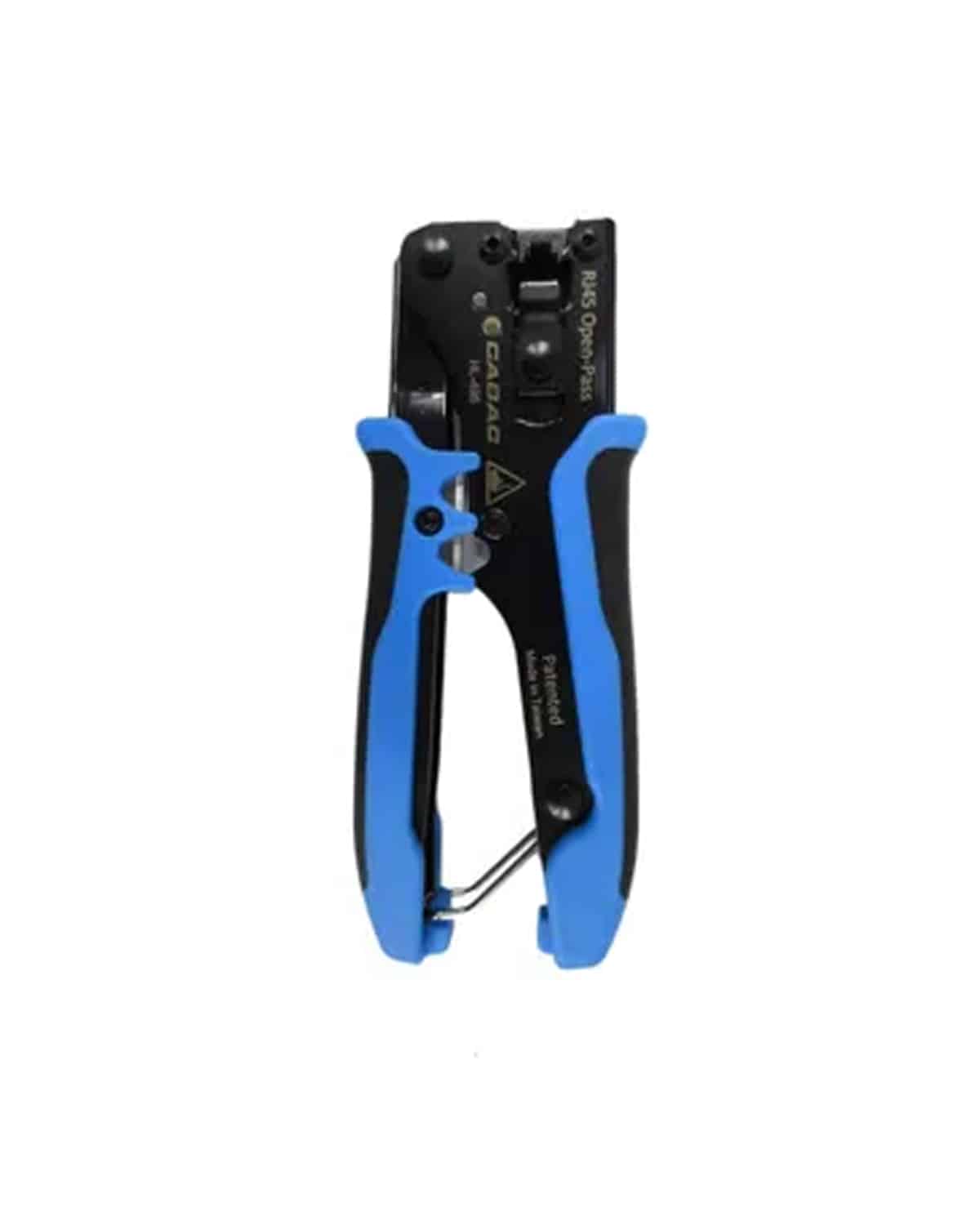- Crimps and cuts Open-Pass RJ45 modular plug
