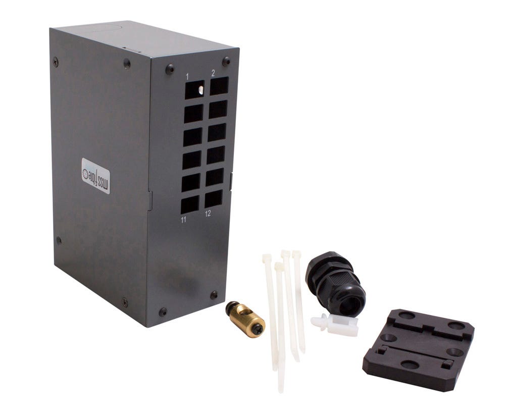 Standard Accessories: Cable gland, central strain relief post, DIN rail mounting clip, laser badge, fibre clips and through adapters