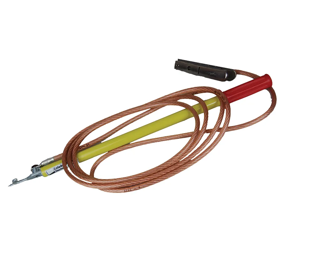 Long HV discharge device designed to safely, easily and effectively discharge residual voltages from equipment after HV testing