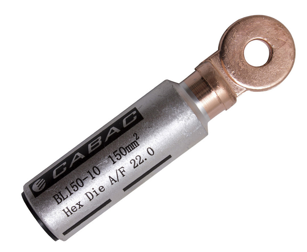 The CABAC BL150-10 Bi-Metal Lug is designed to deliver a reliable termination when connecting stranded sector or circular stranded aluminium conductors to copper busbars or equipment terminals. Manufactured using 99.6% pure aluminium for the sleeve and 99.9% pure copper for the palm, the lug provides excellent conductivity while maintaining mechanical strength on demanding installations. The aluminium barrel is pre-filled with jointing compound that breaks through oxide layers during crimping, improving electrical contact and reducing resistance. For best results, crimp from the palm end first to drive the compound into the conductor strands, ensuring a secure, low-resistance termination suitable for high-current applications.