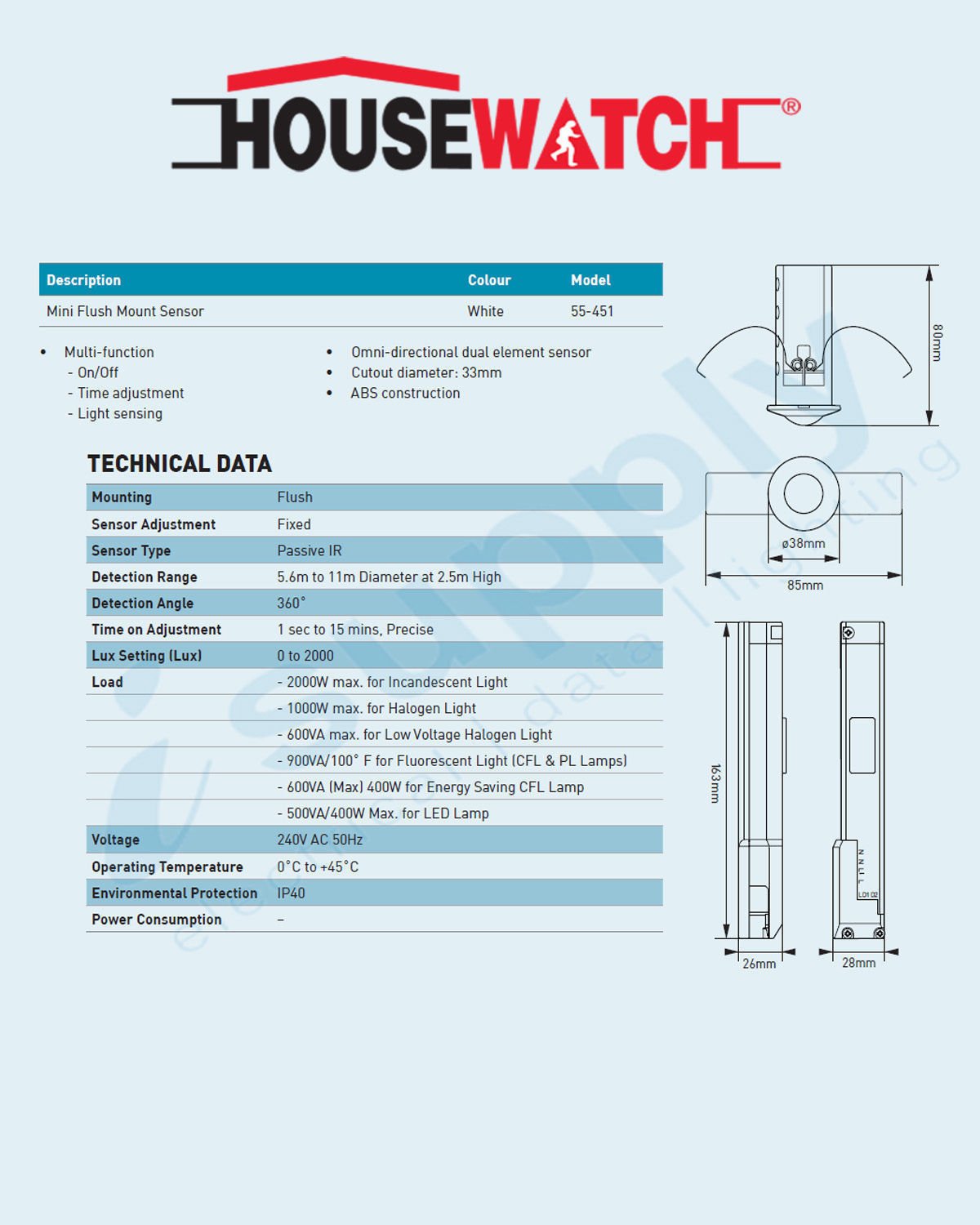 HOUSEWATCH MINI FLUSH MOUNT SENSOR 360 DEGREE OS451A 240V 10A 55-451