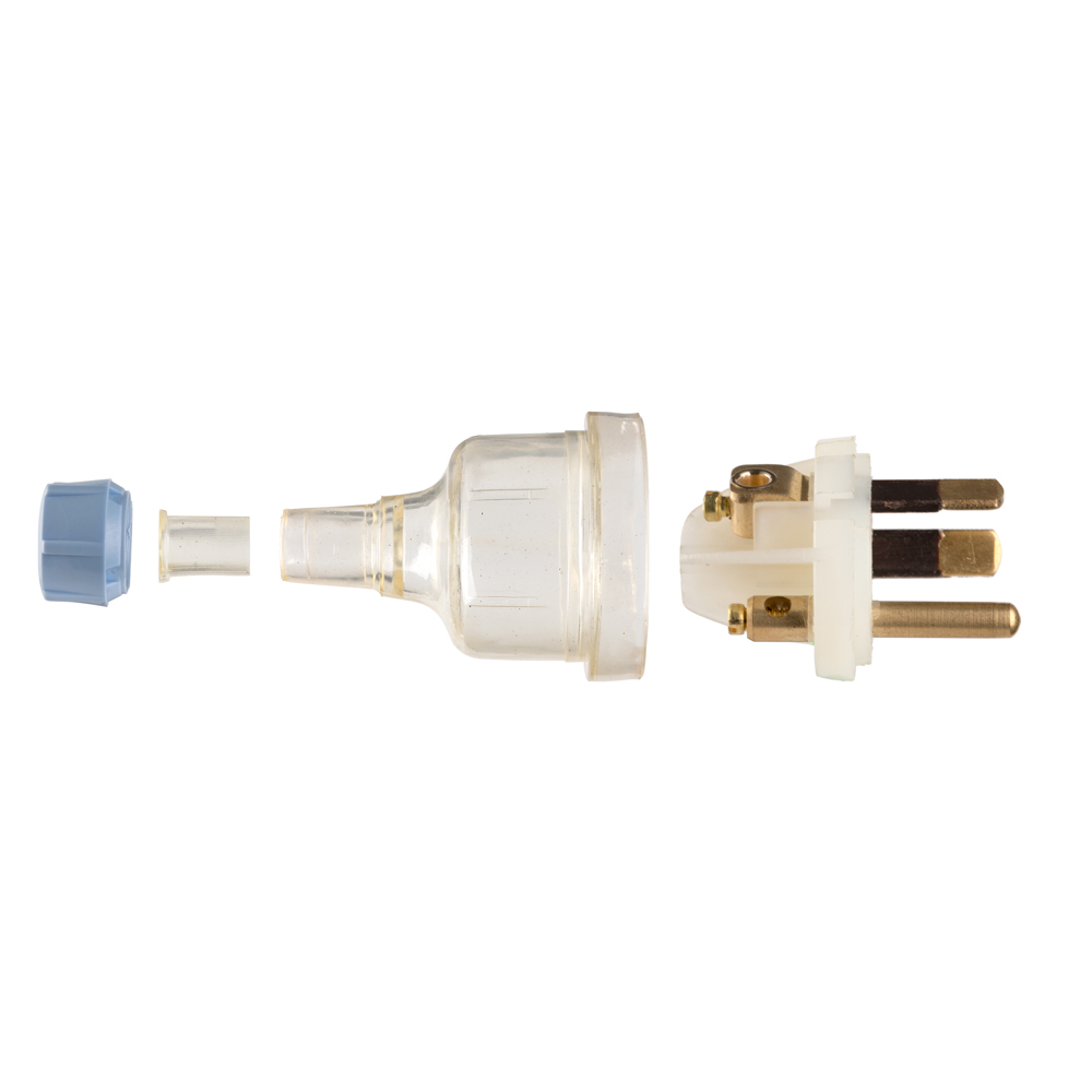 The Transco Extension Plug 3 Pin 10A Round Earth EP/R is designed for AC power with a 10A rating at 240V. It comes in clear and features three pins (active, neutral, and earth) with a round earth pin. The plug accommodates 1mm x 3 cables, is provided unassembled, and is rewireable. It uses a screwing copper ferrule for the connector.