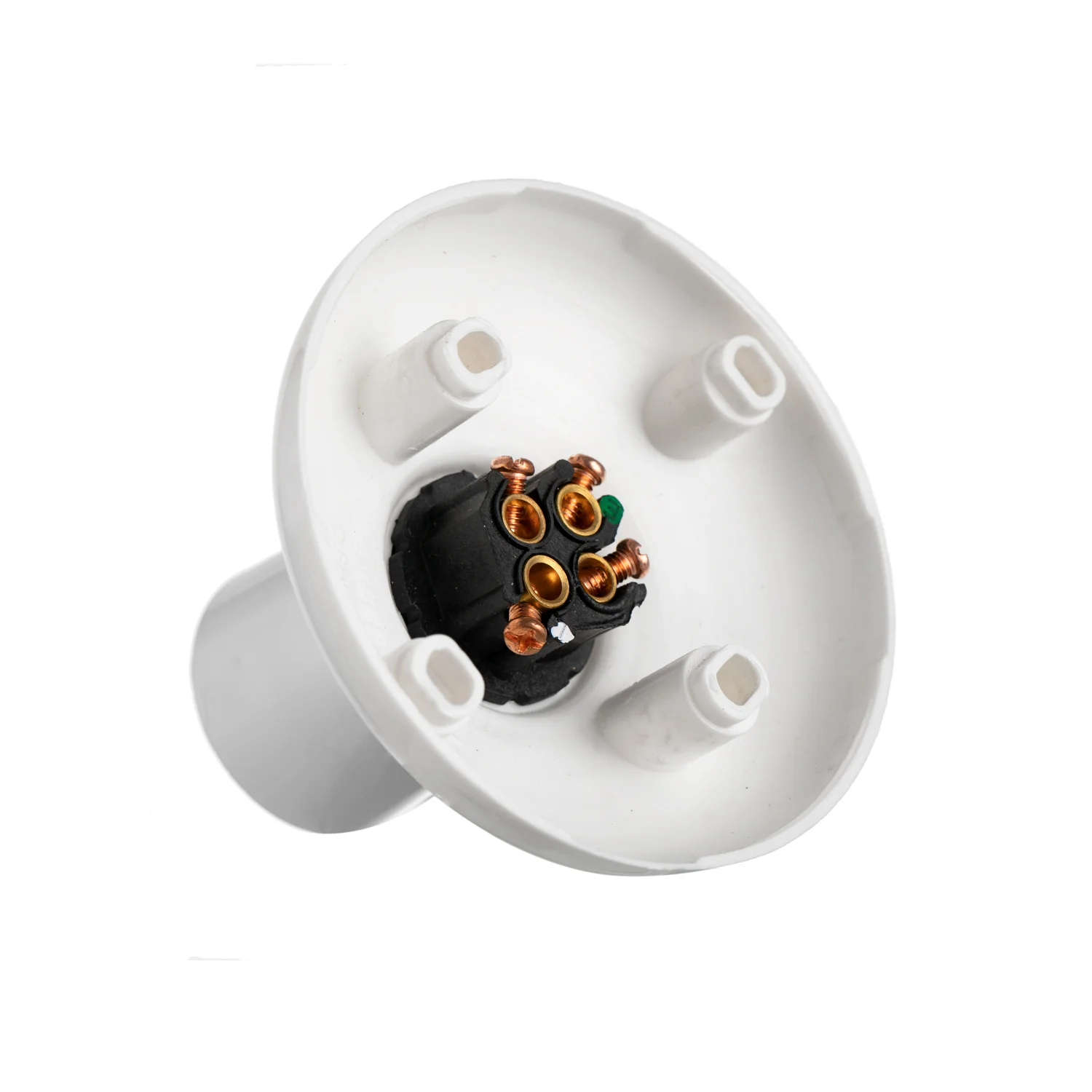 The Transco Large BC Lamp Holder Socket with Skirt and Base Plate BHL is designed for AC power with a 100W rating at 240V and operates at a frequency of 50Hz. It is surface mounted and secured with screws, with a mounting center of 50mm. The socket is made of impact-resistant polycarbonate in electrical white and accommodates 1.5/2.5mm x 4 cables. It features a screwing copper ferrule for the connector.
