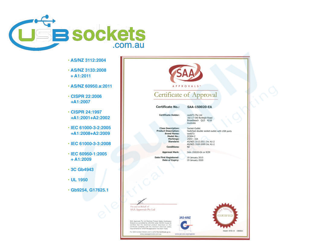 Standard approved dual 240v power socket with twin USB powered charging outlets.