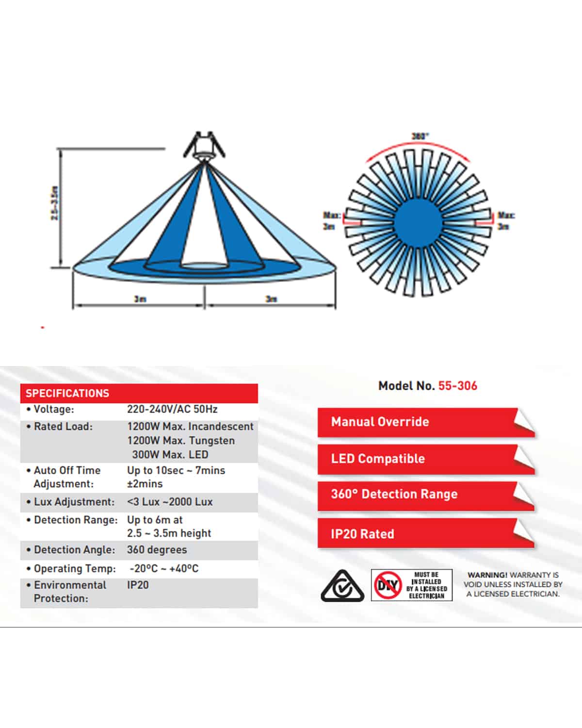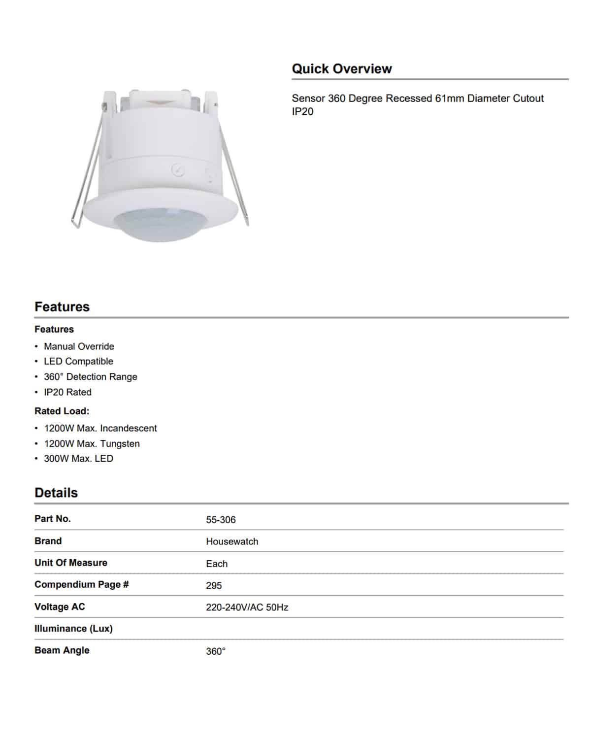 HOUSEWATCH SENSOR 360 DEGREE RESESSED 61MM DIAMETER CUTOUT IP20 55-306