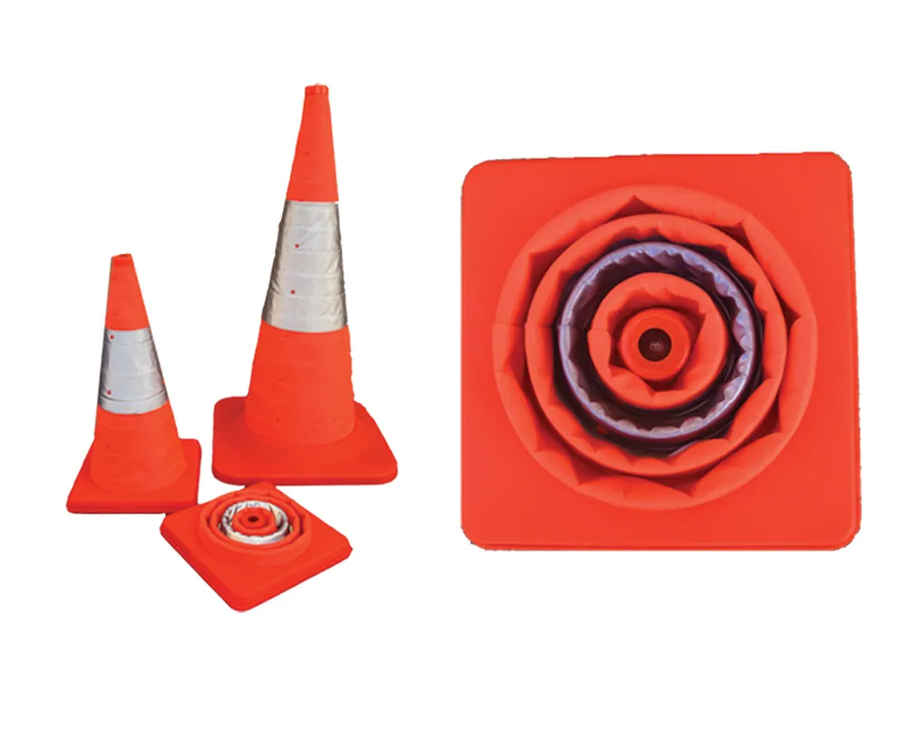Patented collapsible traffic cone designed for applications where storage space is at a premium