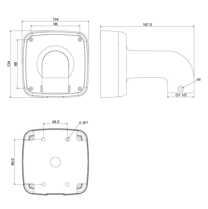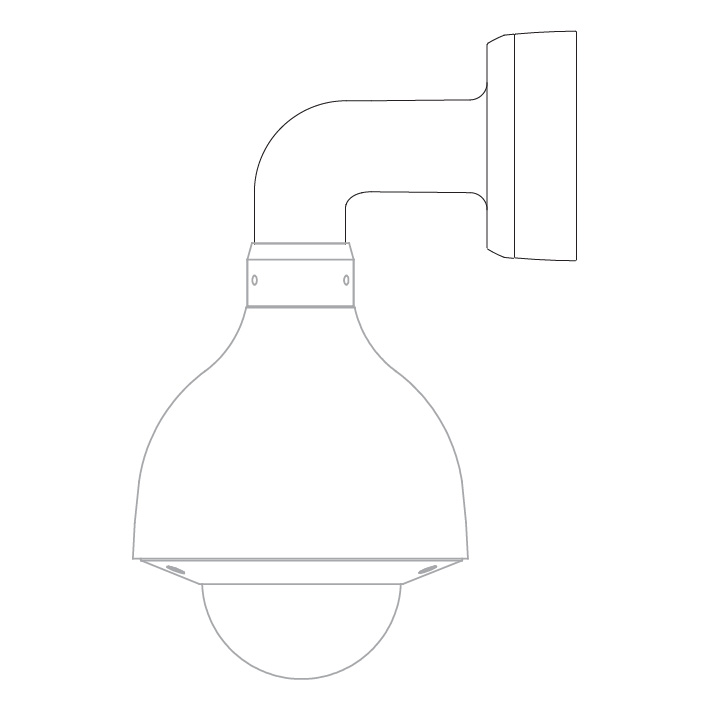 Heavy duty, powder coated aluminium right angle wall mount bracket for surveillance cameras.