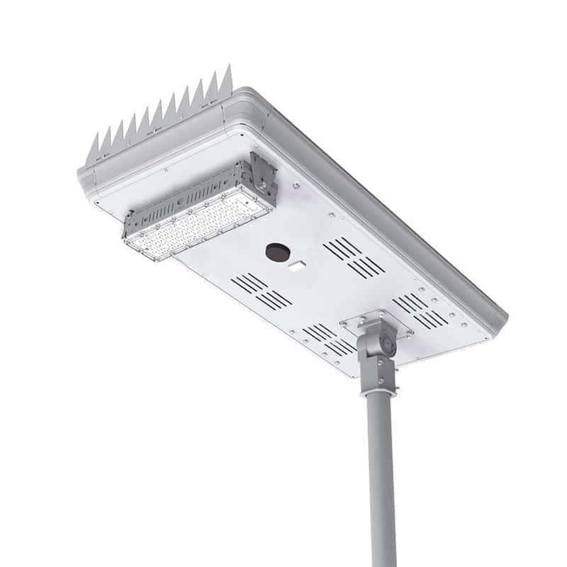 The solar panel unit features a 20W motion activated LED street light plus, the entire system is powered by a rechargeable LiFePo₄ battery. The LED street light and the LiFePo₄ battery are all combined into the one solar panel unit.