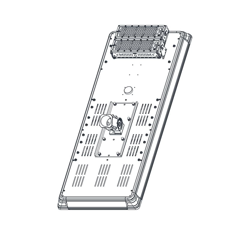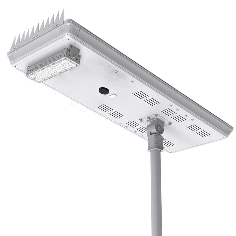 The solar panel unit features a 50W motion activated LED street light plus, the entire system is powered by a rechargeable LiFePo₄ battery. The LED street light and the LiFePo₄ battery are all combined into the one solar panel unit.
