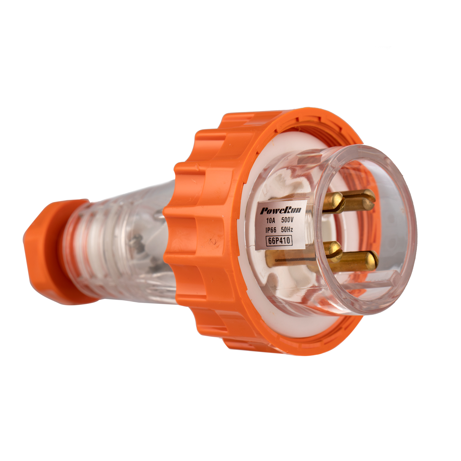 The Transco IP66 Plug 4 Pin 10A 66P410 is designed for A.C. power current with ratings of 10A, 20A, 32A, 40A, and 50A at 500V. It has an IP rating of 66 and is made of UV-resistant plastic, available in orange and clear. This plug features four round pins (two active, one neutral, and one earth) made of brass. It includes a cable entry via a cable gland that accommodates 6mm x 4 cables and complies with AS/NZS 3123 standards.
