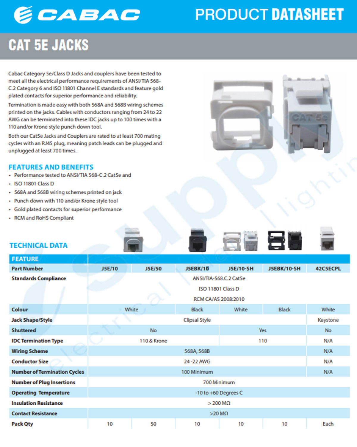Cabac Category 5e/Class D Jacks and couplers have been tested to meet all the electrical performance requirements of ANSI/TIA 568- C.2 Category 6 and ISO 11801 Channel E standards and feature gold plated contacts for superior performance and reliability. Termination is made easy with both 568A and 568B wiring schemes printed on the jacks. Cables with conductors ranging from 24 to 22 AWG can be terminated into these IDC jacks up to 100 times with a 110 and/or Krone style punch down tool. Both our Cat5e Jacks and Couplers are rated to at least 700 mating cycles with an RJ45 plug, meaning patch leads can be plugged and unplugged at least 700 times.