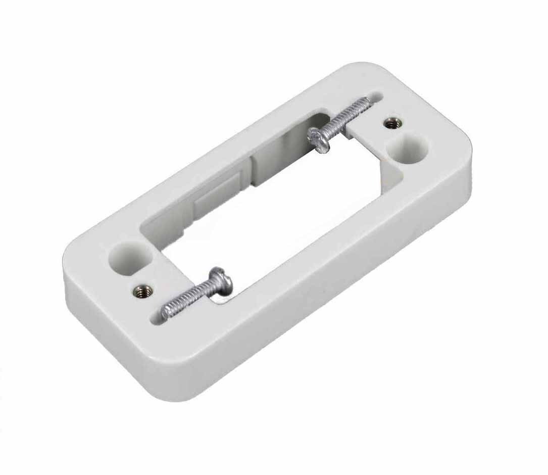 The Transco Mounting Block Architrave Wafer 10mm in white (MB/ASW10W) is made from polycarbonate. It has a fixing center of 74mm, a depth of 10/20mm, and is designed for surface mounting. The mounting block can be positioned horizontally or vertically and has dimensions of W35mm x L85mm. It is compatible with the Transco Wafer 1-2 gang architrave switch for surface mount fitting.