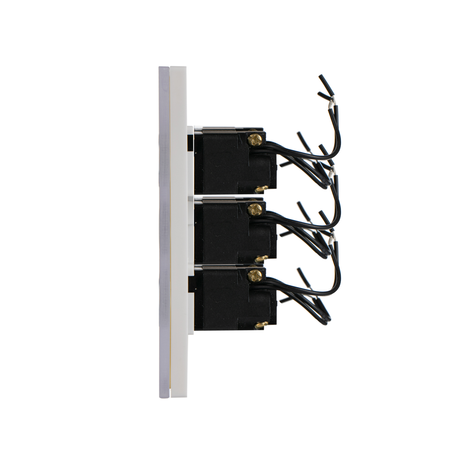 This product operates on alternating current (a.c.) with a single power phase, rated at 10A and 240V. It features a moulded top cover and underbody made from impact-resistant polycarbonate and acrylic, and is available in Pure Snow and Midnight Black. The socket switch is a push-button with LED illumination and accommodates 2.5mm x 4 cables. It measures W72mm x L116mm x D20mm and is designed for horizontal wall mounting with fixing centers of 84mm. It is compatible with all general brackets and mounting blocks on the market and conforms to AS/NZS3100, AS/NZS3112, and AS/NZS3133 standards.