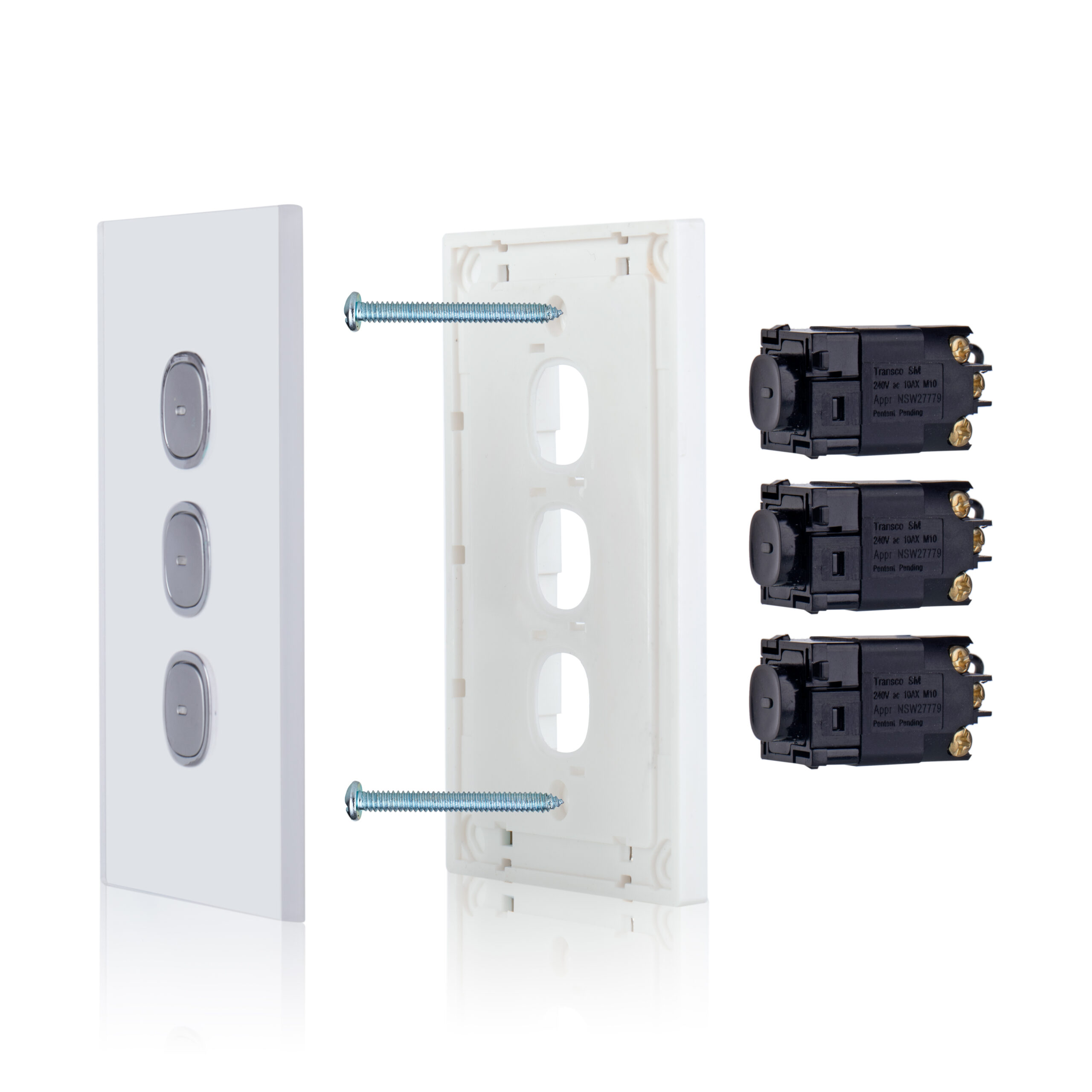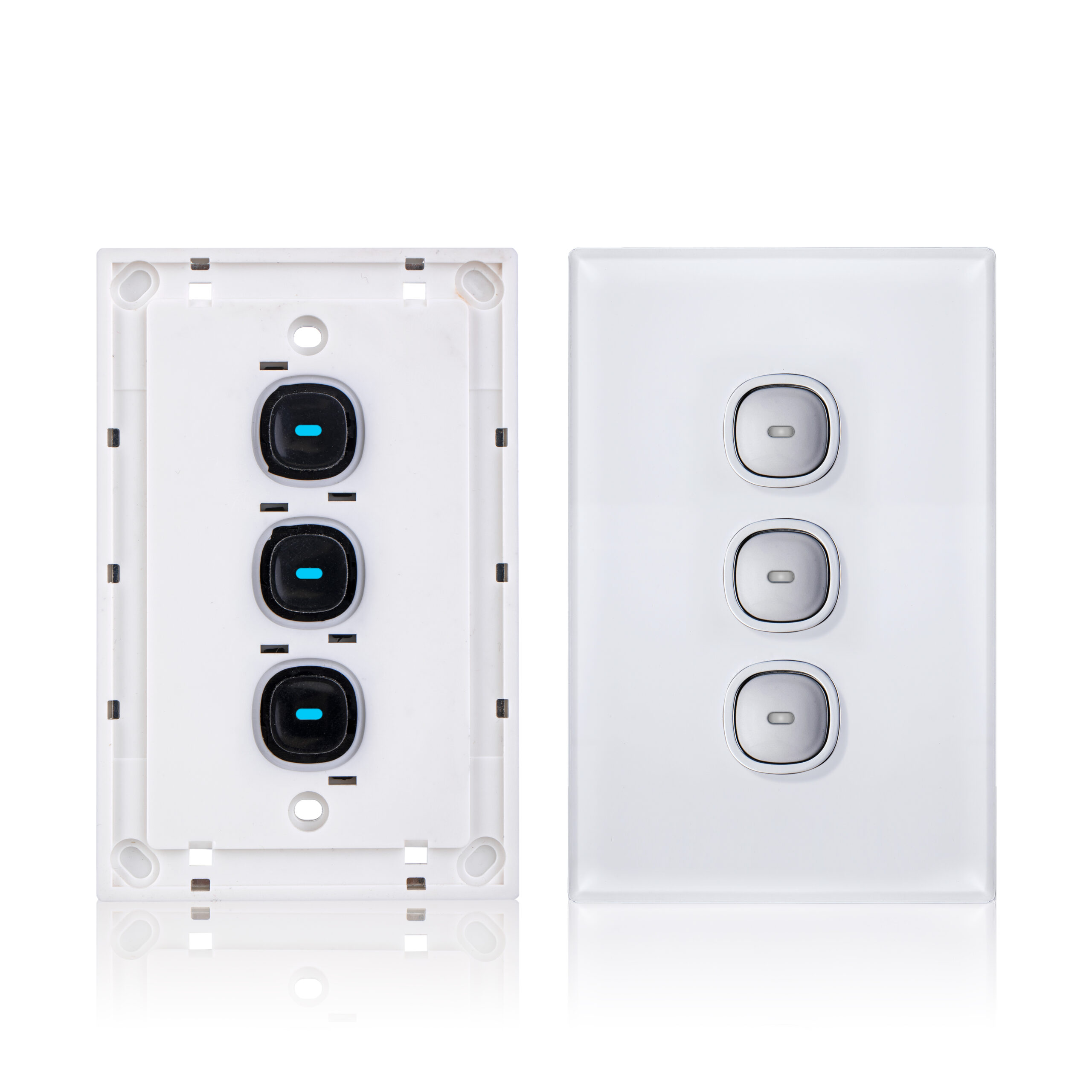 This product operates on alternating current (a.c.) with a single power phase and is rated for 10A and 240V. It features a moulded top cover and underbody made of impact-resistant polycarbonate and acrylic, available in Pure Snow and Midnight Black. The socket switch is a push-button with LED illumination and accommodates 2.5mm x 4 cables. It has dimensions of W72mm x L116mm x D20mm, is designed for horizontal wall mounting with fixing centers of 84mm, and fits all general brackets and mounting blocks on the market. It complies with AS/NZS3100, AS/NZS3112, and AS/NZS3133 standards.