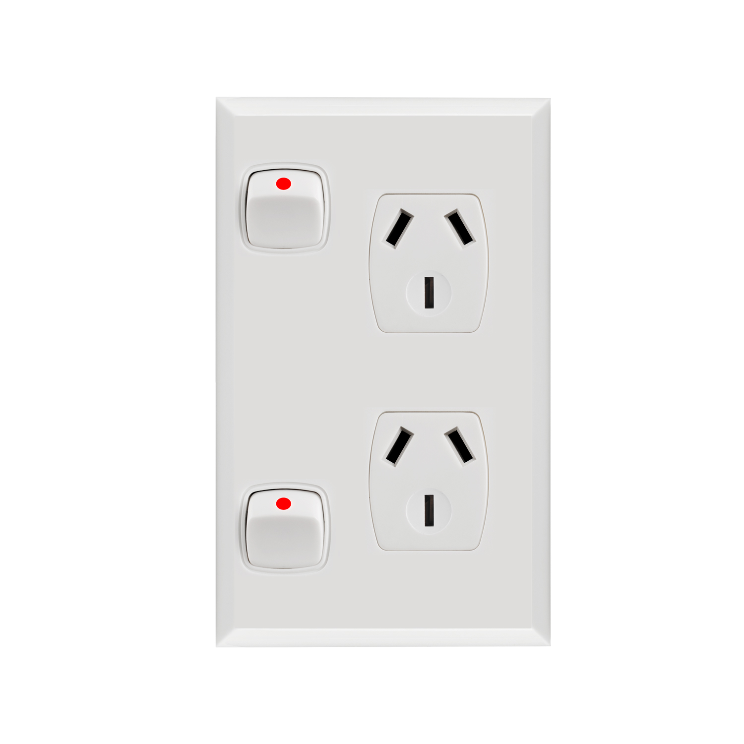 The Transco Double Power Point Vertical P2V has a moulded top cover and underbody made from impact-resistant polycarbonate. Available in electrical white, it is designed with a single switch pole and can accommodate 1, 2, or 3 gang configurations and 1 or 2 socket outlets. It includes three pins (active, neutral, earth) with a flat earth pin and uses copper ferrules for cable connections. This power point supports 2.5mm x 3 cables and measures W72mm x L116mm x D20mm. It is intended for vertical wall mounting, with fixing centers at 84mm, and fits all standard brackets and mounting blocks for both flush and surface mount installations. It complies with AS/N standards.