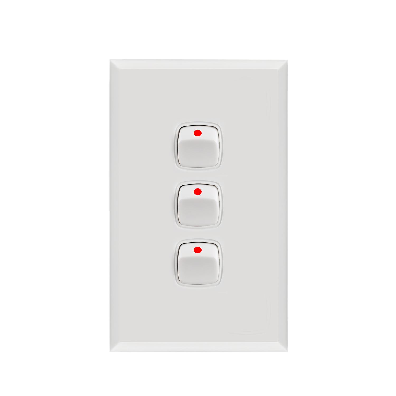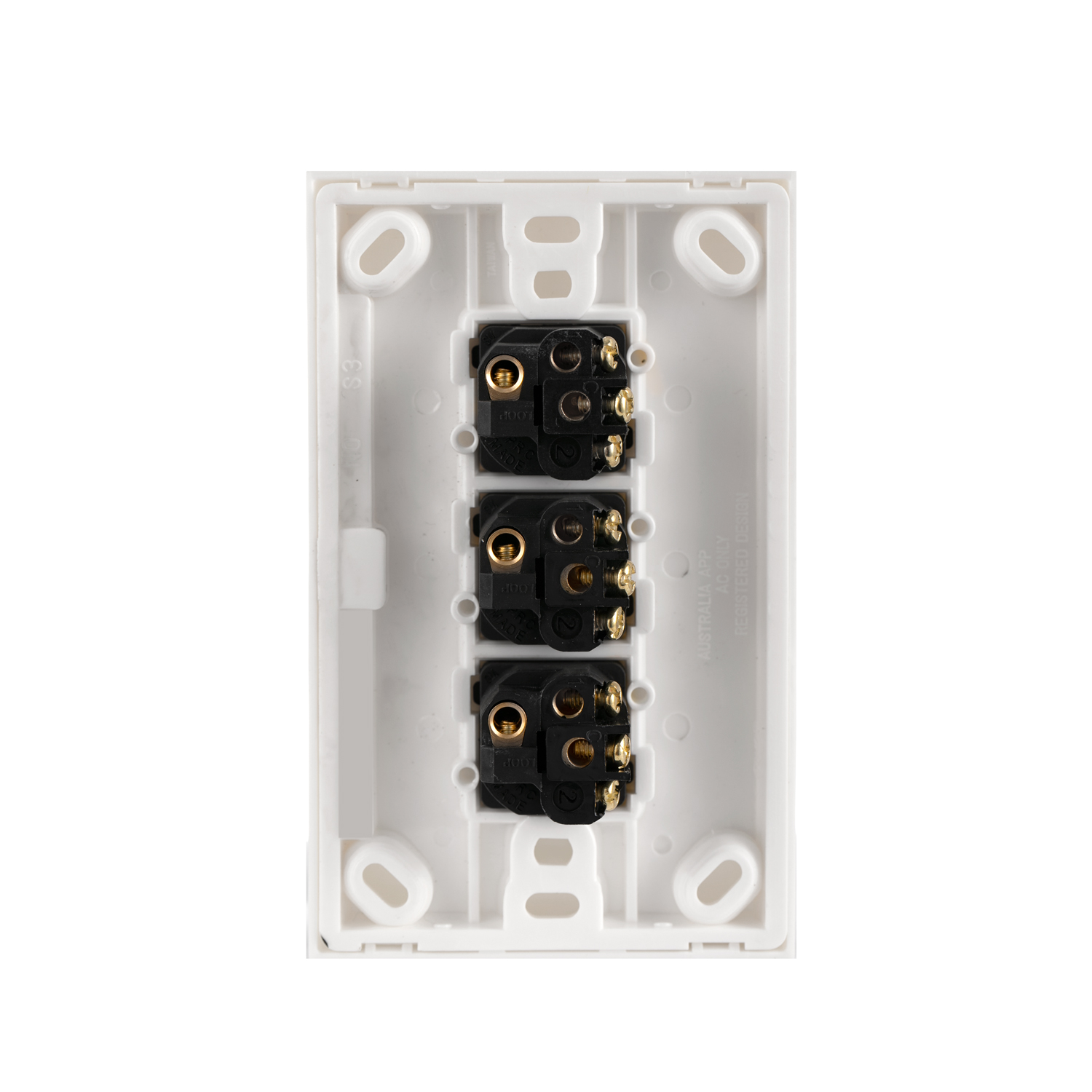 Transco Switch 3 Gang 10a S3. These outlets are surface-mounted and can easily attach to existing power point mounting brackets. Dimensions are approximately 78mm in height, 198mm in width, and 25mm in depth. Australian Approval N25697. Silver covers are also available. A 25mm deep mounting block is available here.