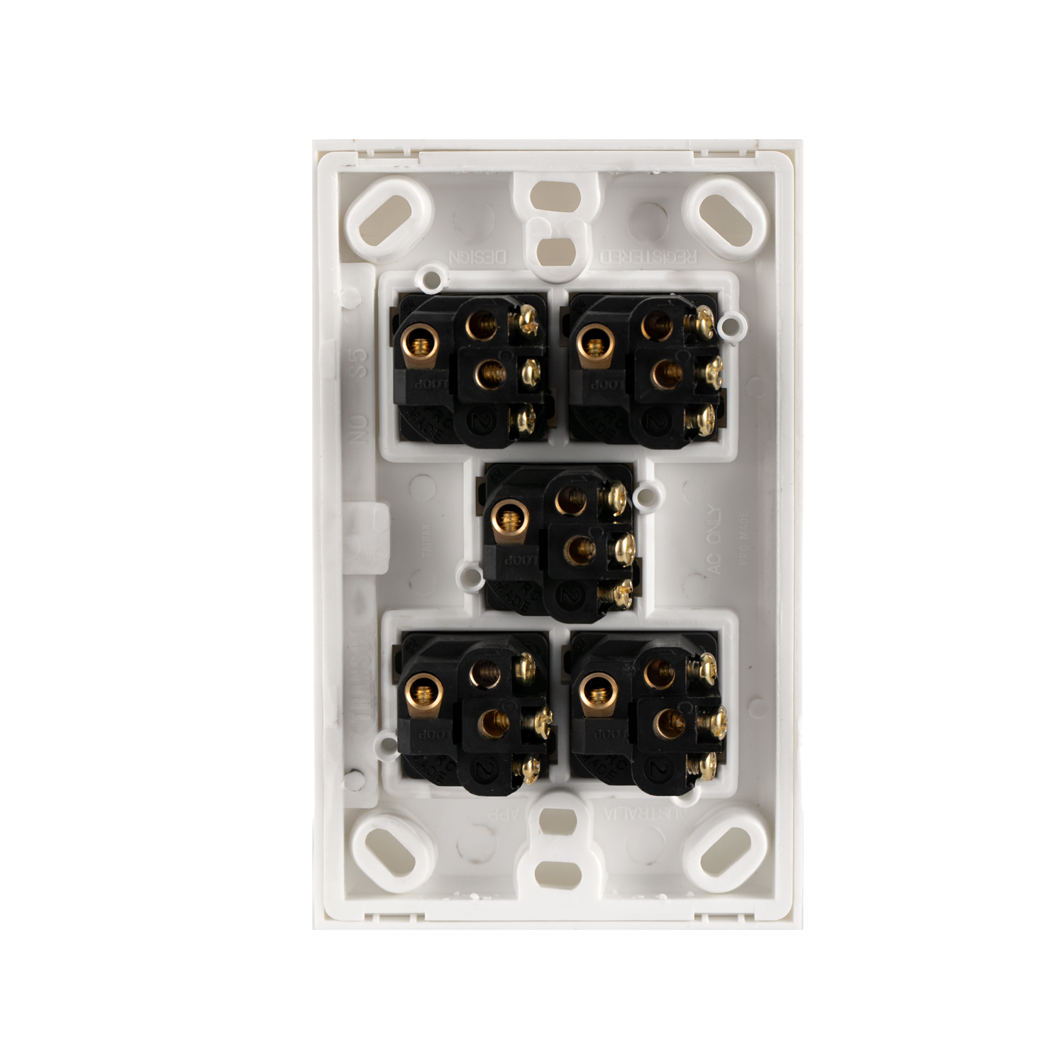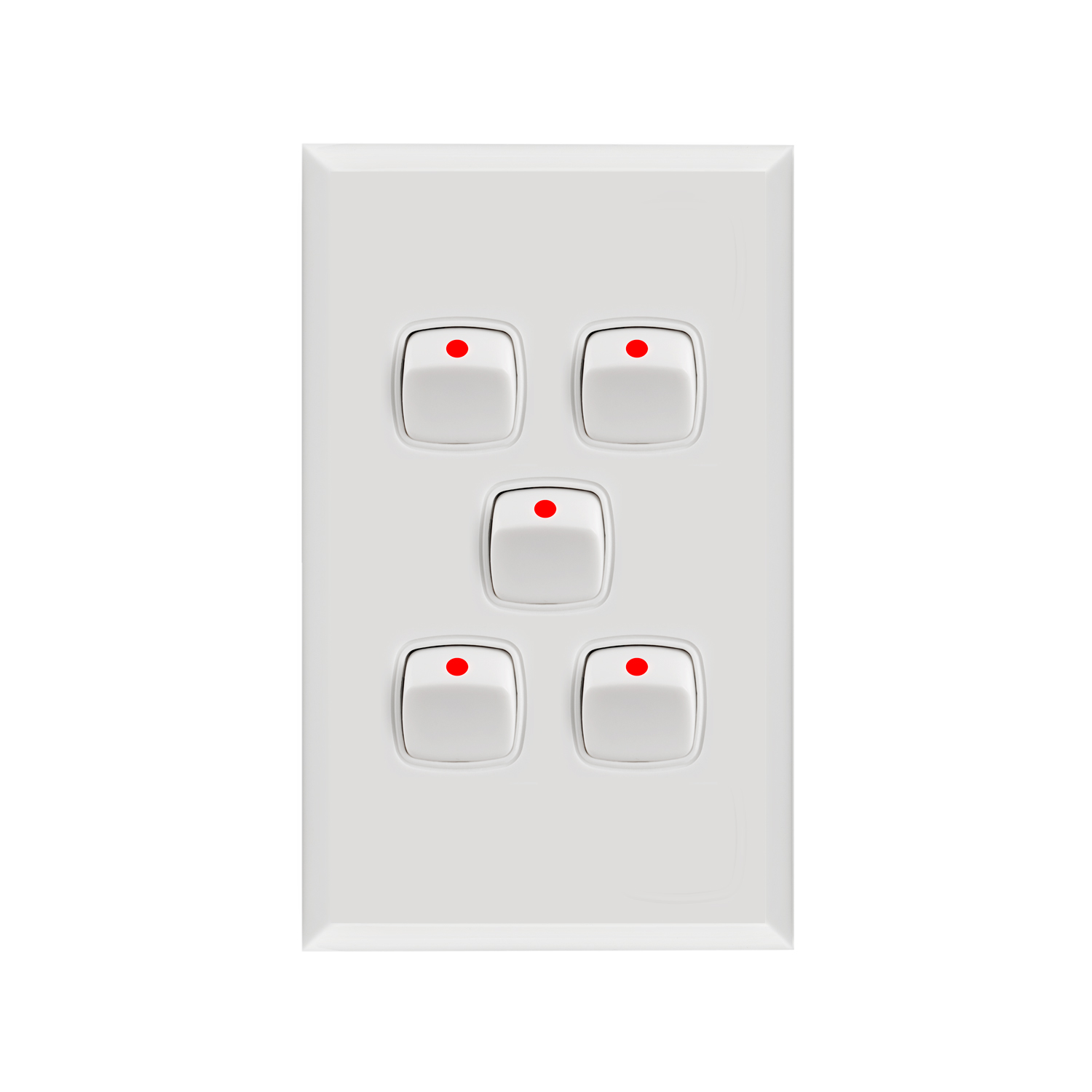 This standard design large plate light switch is ideal for home and office installations. Dimensions are 73mm x 118mm with fixing centers at 84mm. It can be used as a five gang vertical or horizontal light switch.