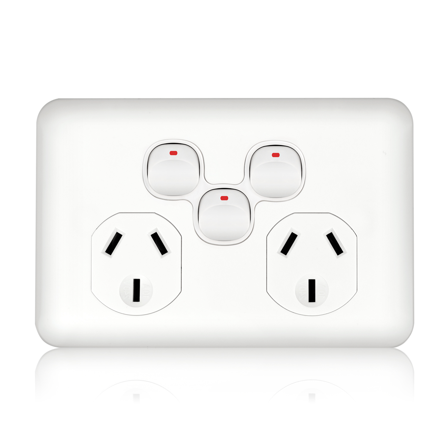 The power type is AC with a single-phase, and it has a rating of 10A, 15A, or 20A at 240V. It features a molded top cover and underbody made of impact-resistant polycarbonate, available in electrical white or black. The switch poles are single, with socket configurations of 1, 2, or 3 gangs and socket outlets of 1 or 2. It includes 3 pins (active, neutral, earth), a flat earth pin, a copper ferrule x3 cable connector, and accommodates a cable capacity of 2.5mm x3. With dimensions of W72mm x L116mm x D20mm, it is designed for horizontal on-wall mounting, fits general flush mount brackets, and is compatible with Transco Wafer Series mounting flanges, made in accordance with AS/NZS3100, AS/NZS3112, and AS/NZS3133 standards.