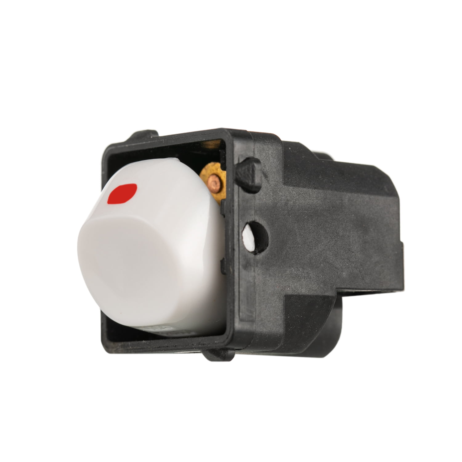 The device operates with AC power and is rated for 10A, 15A, 20A, or 32A at 240V and 50Hz. It comes in electrical white or black and features a single pole. The wiring system supports two-way switching for 10A, 15A, and 20A, and one-way switching for 32A. It uses a rocker method of operation and a screwing copper ferrule connector, accommodating cables of 2.5mm x 4. The assembly arrangement is basic.