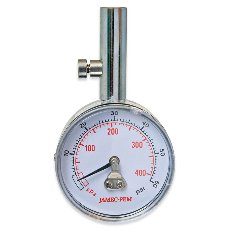 A durable Jamec PEM tyre gauge with 50 mm dial and dual-scale display for accurate tyre pressure checks in workshops, service vehicles, and light trade use.