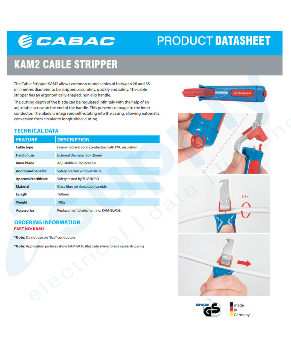 The KAM range of strippers are used to strip circular cables. They have a unique cranked swivel blade that automatically swivels when the operator changes the strip direction from the circular cut to the longitudinal cut. They have an adjustable depth of cut. There are three basic sizes for various cable ranges, and the KAM1/K has a knife included.