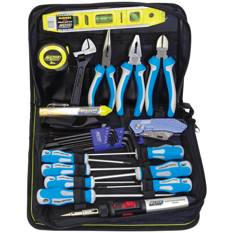 Major Tech?s TKH3 DIY Tool Kit is a convenient, compact tool kit for homeowners and DIYers. This tool kit has been specifically built up with tools that every household requires. The kit includes a zip up tool bag, a 7-piece screwdriver set, a 3m measuring tape, an adjustable spanner, a cutting plier, a combination plier, a long nose plier, a gas soldering Iron and solder, a level, a headlamp, a foldable knife and a hex key set.