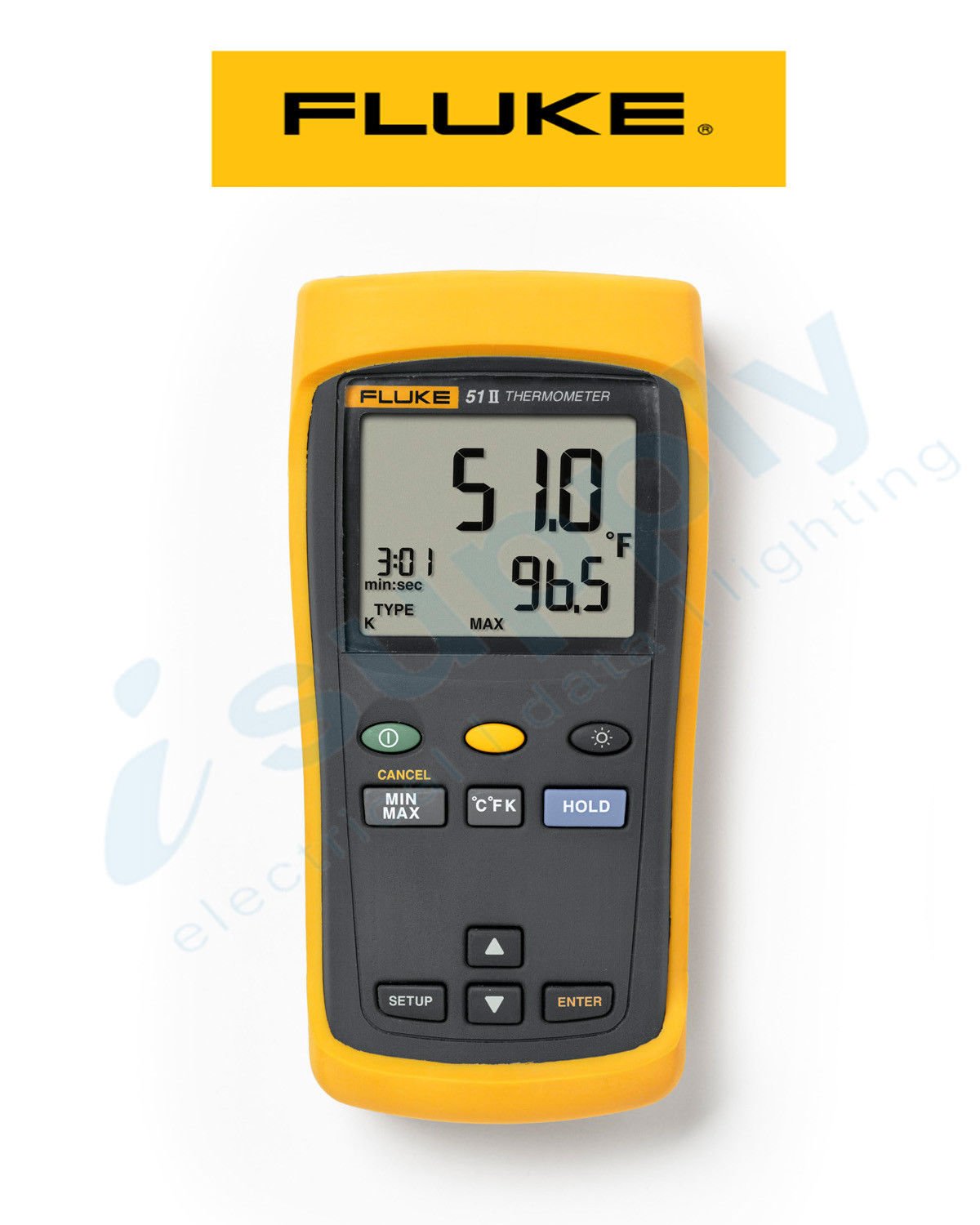 The Fluke 50 Series II contact thermometers offer fast response and laboratory accuracy (0.05% + 0.3°C) in a rugged, handheld test tool. Take contact temperature for checking motors, insulation, breakers, pipes, corroded connections, liquids, and wires with industrial standard J, K, T, E, N, R, and S type thermocouple (temperature sensors).