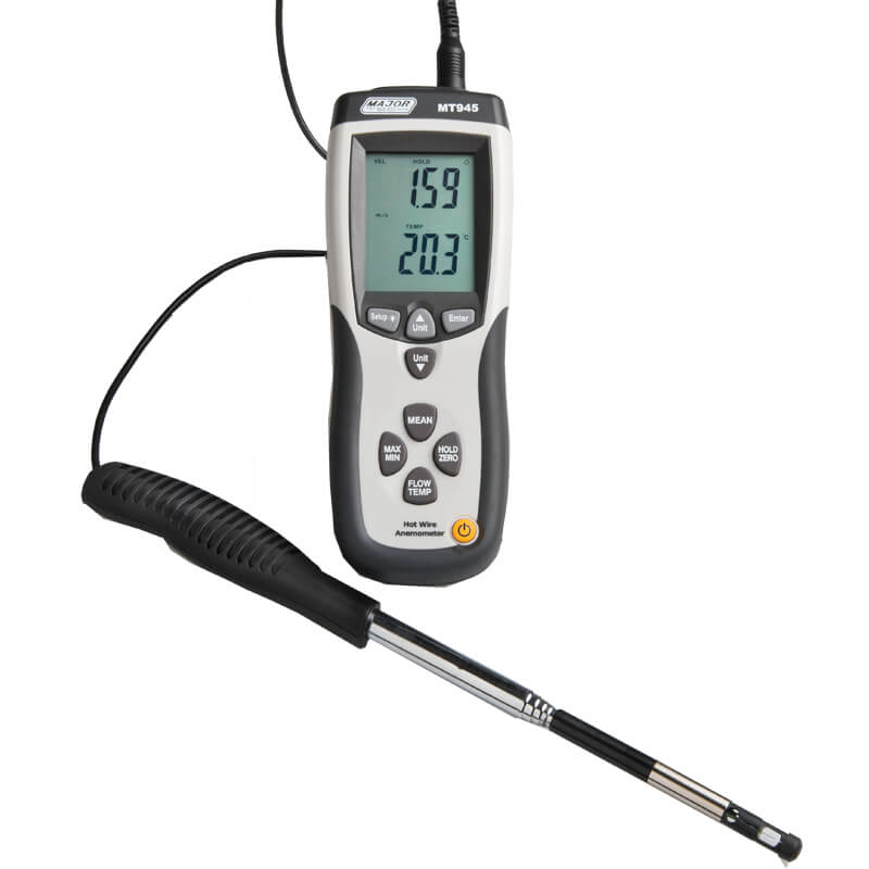 The MT945 is microprocessor designed for low air velocity and the slim probe makes it ideal for grilles and diffuses. The combination of hot wire and standard thermistor, delivers rapid and precise measurements even at low velocity values. The telescoping probe is ideal for measuring HVAC ducts and other small vents.