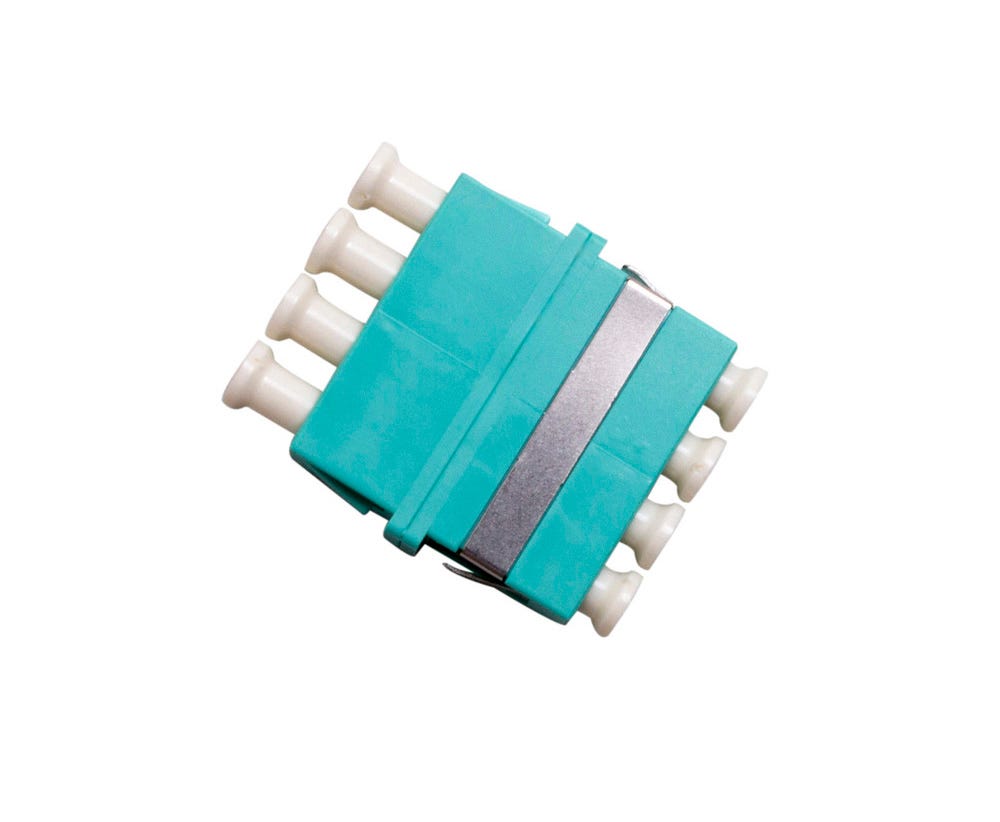 Compact LC OM3 quad fibre adaptor with ceramic sleeves and metal clips for reliable, high-density multimode connections.