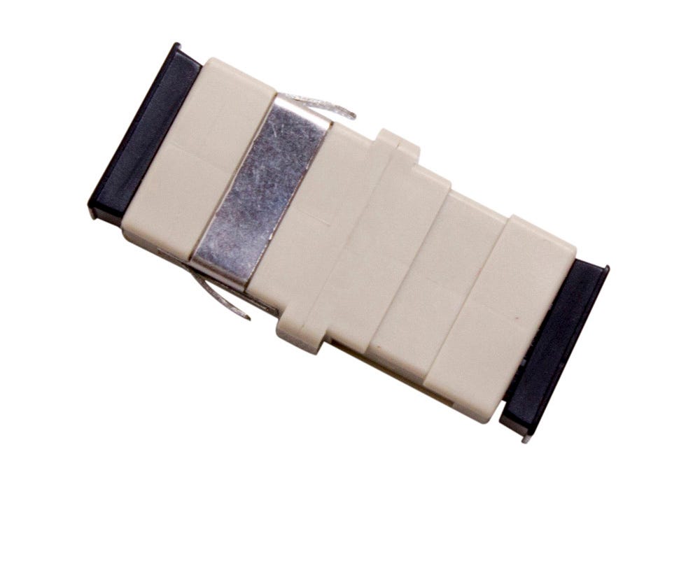 SC OM1 multimode simplex fibre thru adaptor with ceramic sleeve, flangeless design, and dust caps for reliable, standards-compliant connections.