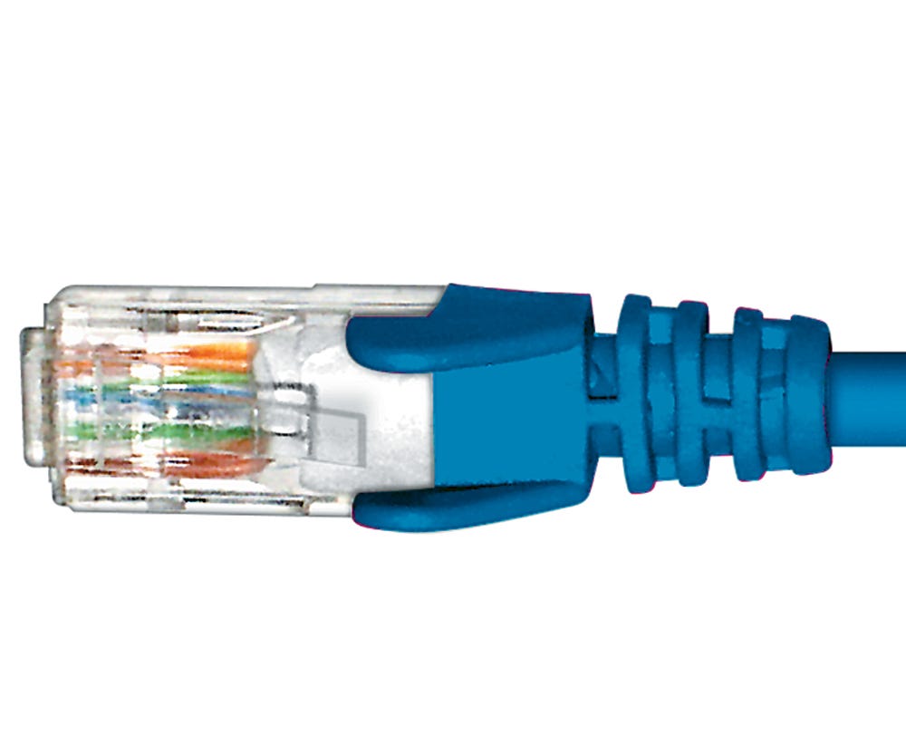 CAT5e patch lead made from 24AWG stranded bare copper wire with fully moulded strain relief boot