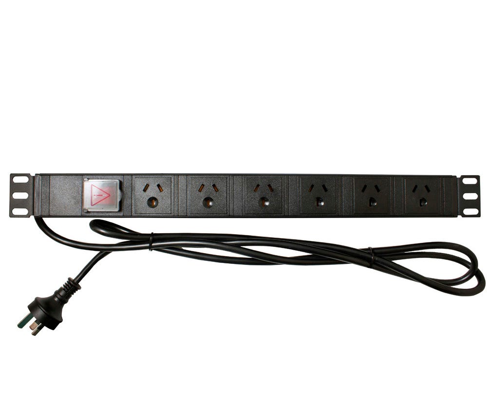 server rack cabinet. The six outlets are Australian type sockets built into a 1RU 19 inch mounting unit. An On/Off switch, which controls all six outlets, brings convenience