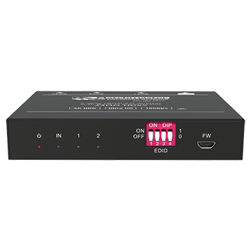 HDMI? 4K High Speed 2 way splitter with built-in scaler to allow 4K signal to downscale to 1080p. Video scaling allows content shared across two displays with different resolution capabilities; one could be displaying 4K while the 2nd display could be 1080p.