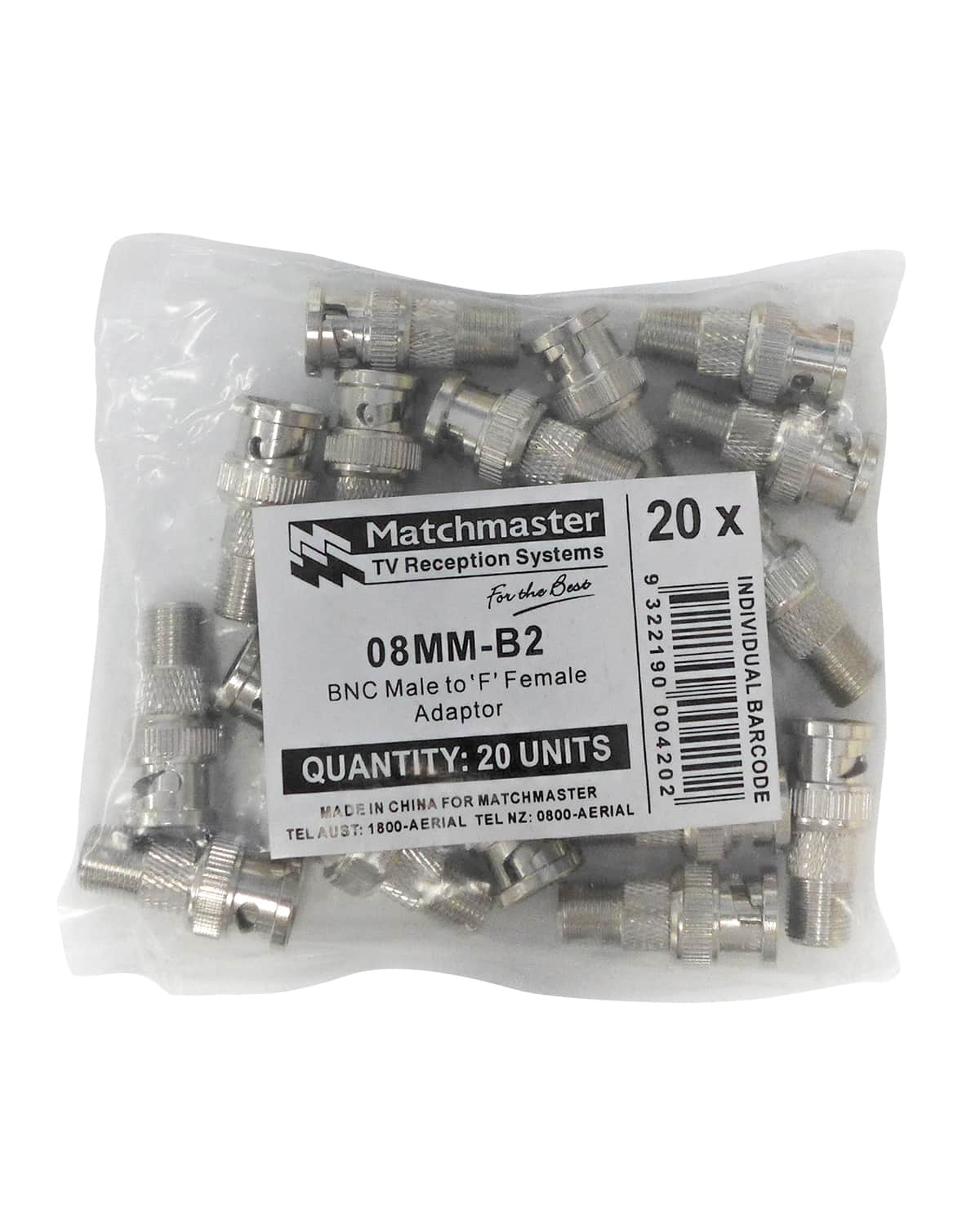 MATCHMASTER ADAPTOR ‘F’ FEMALE TO BNC MALE (20 Pack) : 08MM-B2