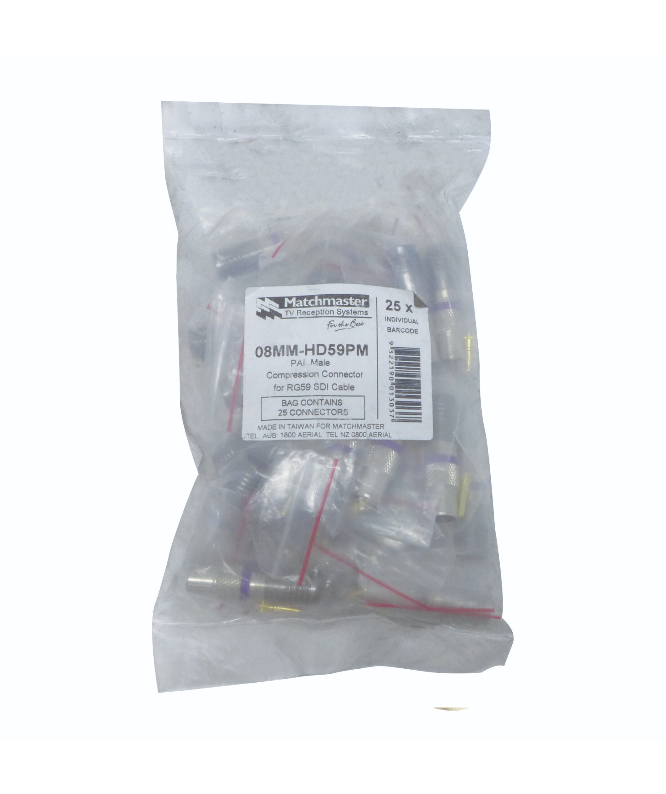 MATCHMASTER PAL MALE COMPRESSION CONNECTOR FOR RG59 SDI CABLE (25 Pack) : 08MM-HD59PM