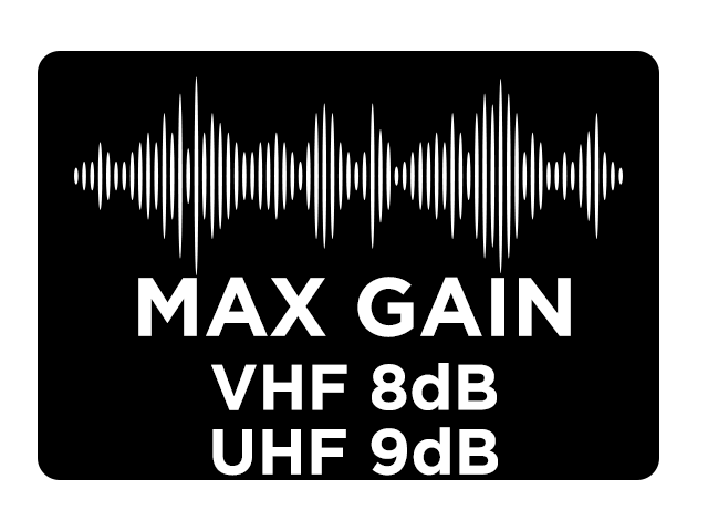 • Antenna Max Gain: UHF 7-10dB & VHF 7-9dB