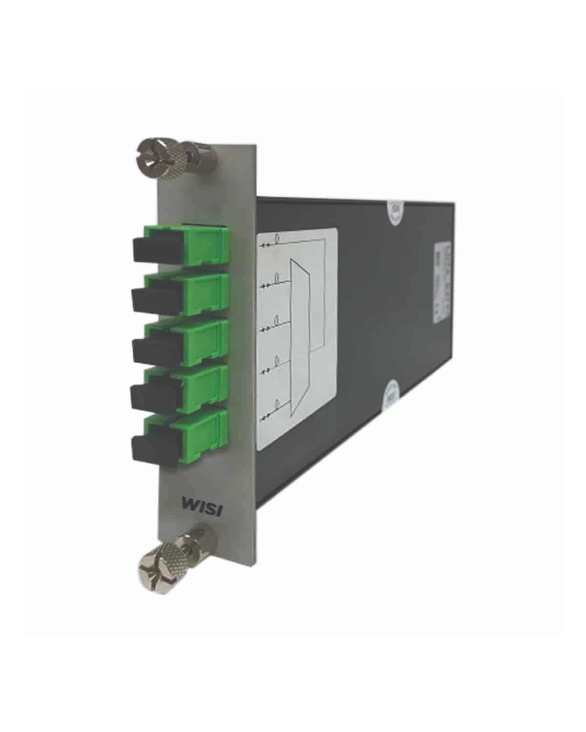 Optical PLC splitter with one input to 4 outputs (SC/APC) to fit with 20MM-LP40 19″ mounting frame or 20MM-LX50-230 base unit.