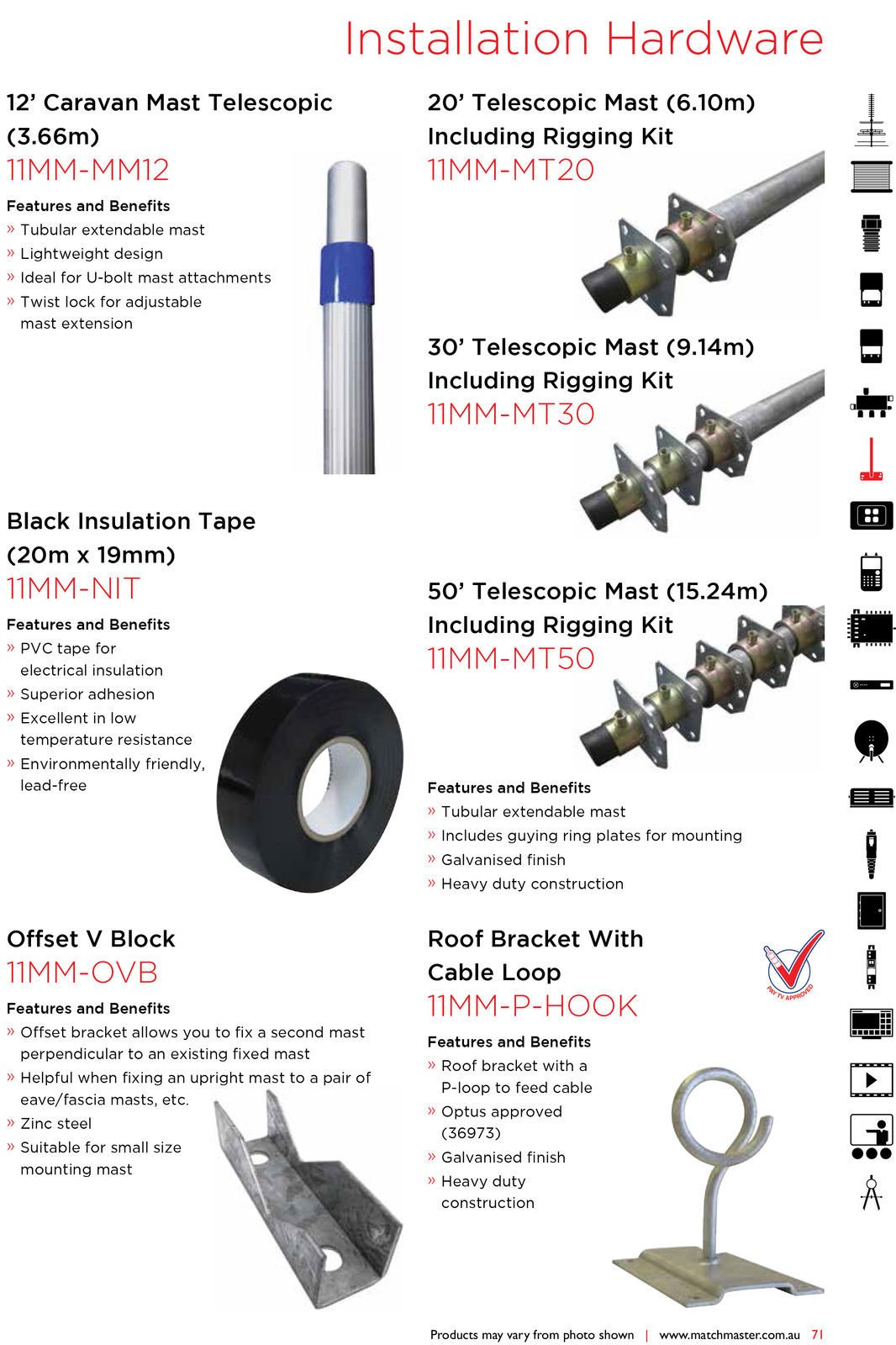 Matchmaster has a vast range of heavy duty hardware for both Antenna and Satellite mounting. All of our outdoor mounting hardware is made from Galavized Steel to prevent oxidation and suit our harsh coastal climate. We have a large range of mast and cable flashings plus accessories to assist in any installation.